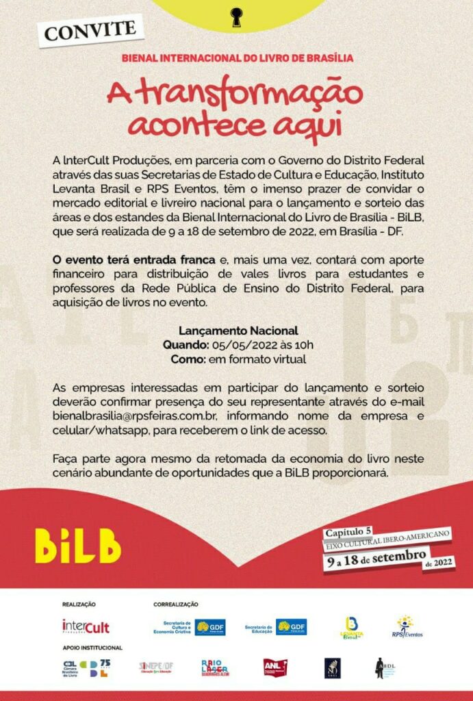No próximo dia 5 de maio, às 10h, acontecerá o lançamento da Bienal Internacional do Livro de Brasília – BiLB, que será realizada de 9 a 18 de setembro de 2022, em Brasília – DF.